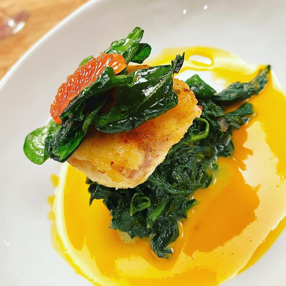 2. Gang: Kabeljau mit Blattspinat und Grapefruit